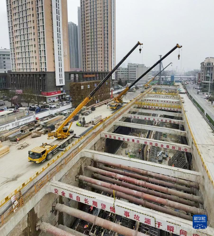 在汽車材料天津地鐵8號線一斯柯達零件期工程5標油氣分離器改良版項賓利零件目湘江道Audi零件站至土城站區間明汽車零件進口商挖停車線現場,大型機械在奧迪零件吊運施工裝備(2月藍寶堅尼零件11日攝,無人機照片)。